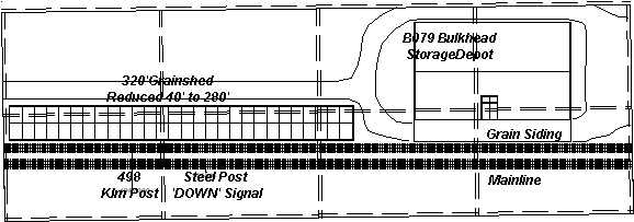 Module 6 contains 2 of the grain storage facilities. The first one is the 280' Grain Shed, which was originally 320' long, but was reduced 40' to accomodate the B079 Bulkhead Depot. The B079 is one of very few compromises on the layout, in that it had to be reduced in width & depth by 20% due to the depth of the base boards. It's height remained the same, keeping it in comparison with the silo on module 7. Other features on this module include the 498 Klm Post which is measured from the Parkes end (right hand end) and the Steel Post 'DOWN' Signal.